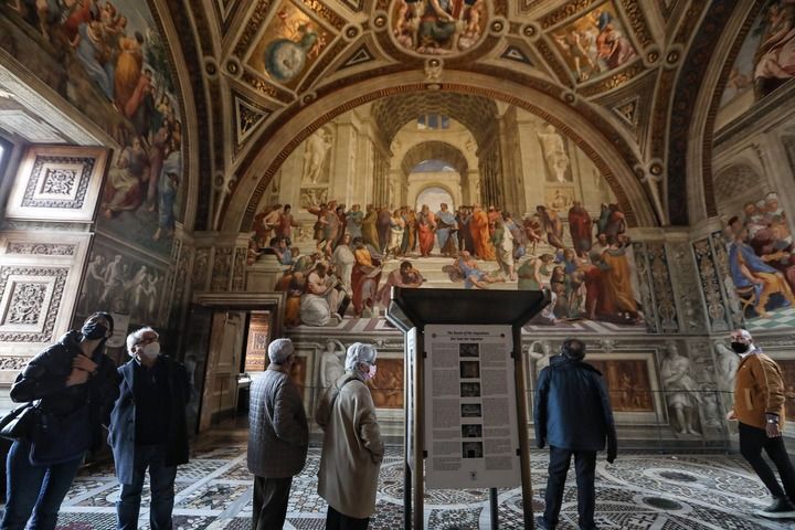2月5日,人们戴着口罩在梵蒂冈博物馆欣赏拉斐尔的壁画作品《雅典学院》。(新华社记者程婷婷摄)