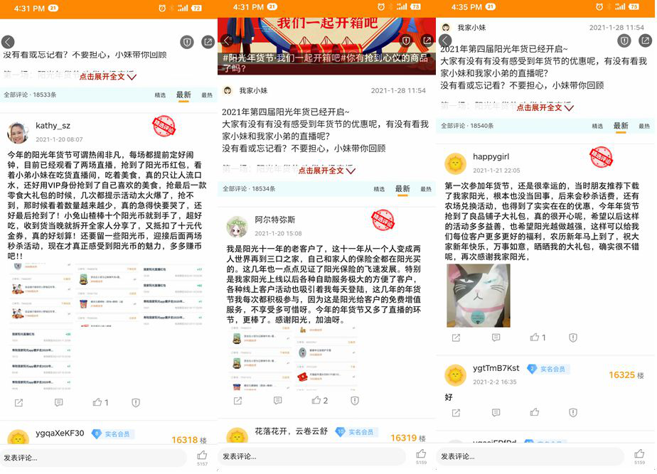 年货节活动还在App社群板块开设互动专栏,放置每场次活动内容和直播回放视频,用户可晒出年货节秒杀到的“战利品”,与网友进行互动交流。经过一个月的积累,超人气话题讨论度破纪录。“我家阳光”的用户们,用真诚的评论和图片支持年货节的开展,表达对阳光年货节这一活动的认可和喜爱。