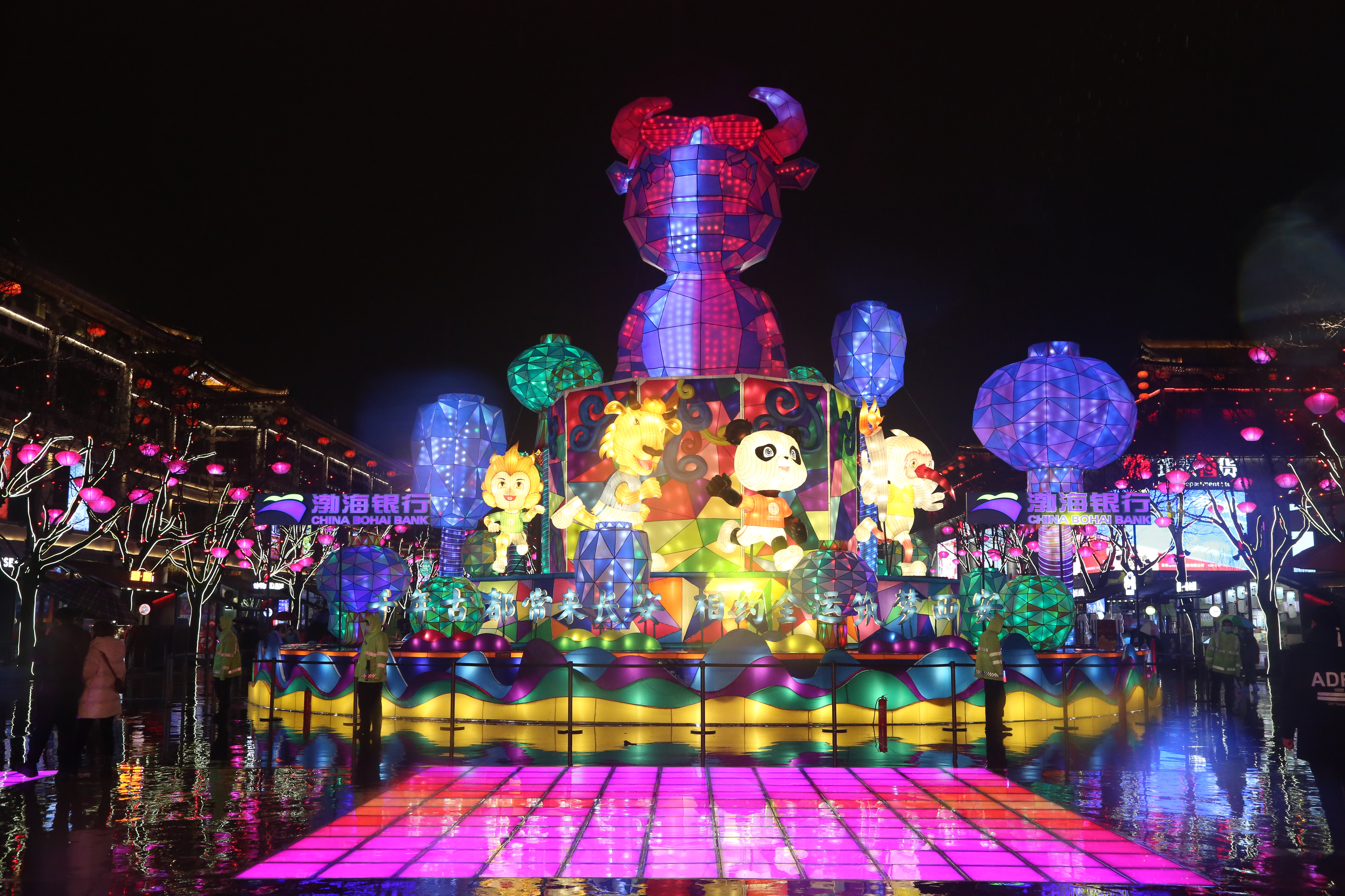 异彩花灯,喜庆吉祥。今年春节,大唐不夜城推出牛气冲天、高山流水、全运花开、富贵花鸟等九组花灯装置。各项演出活动也异彩纷呈:民俗歌灯会上,非遗老师们做花灯、讲习俗,引来游客纷纷驻足;北广场的祈福灯墙上挂满了灯谜,妙趣横生;走出画卷的唐代仕女,挑灯甩袖,点灯祈福,带领游客领略长安故事;带着虎头帽的小朋友们唱着歌谣,如同一个个可爱的福娃;美食街各色美味飘香,别有一番风味……蒙蒙细雨中,长安城映出隐隐约约的倒影,别有一番韵味。永宁门城墙段别样繁华的花灯,将城墙的历史和现代科技的光影相映成辉,带领群众重温千年前的华丽光景。
