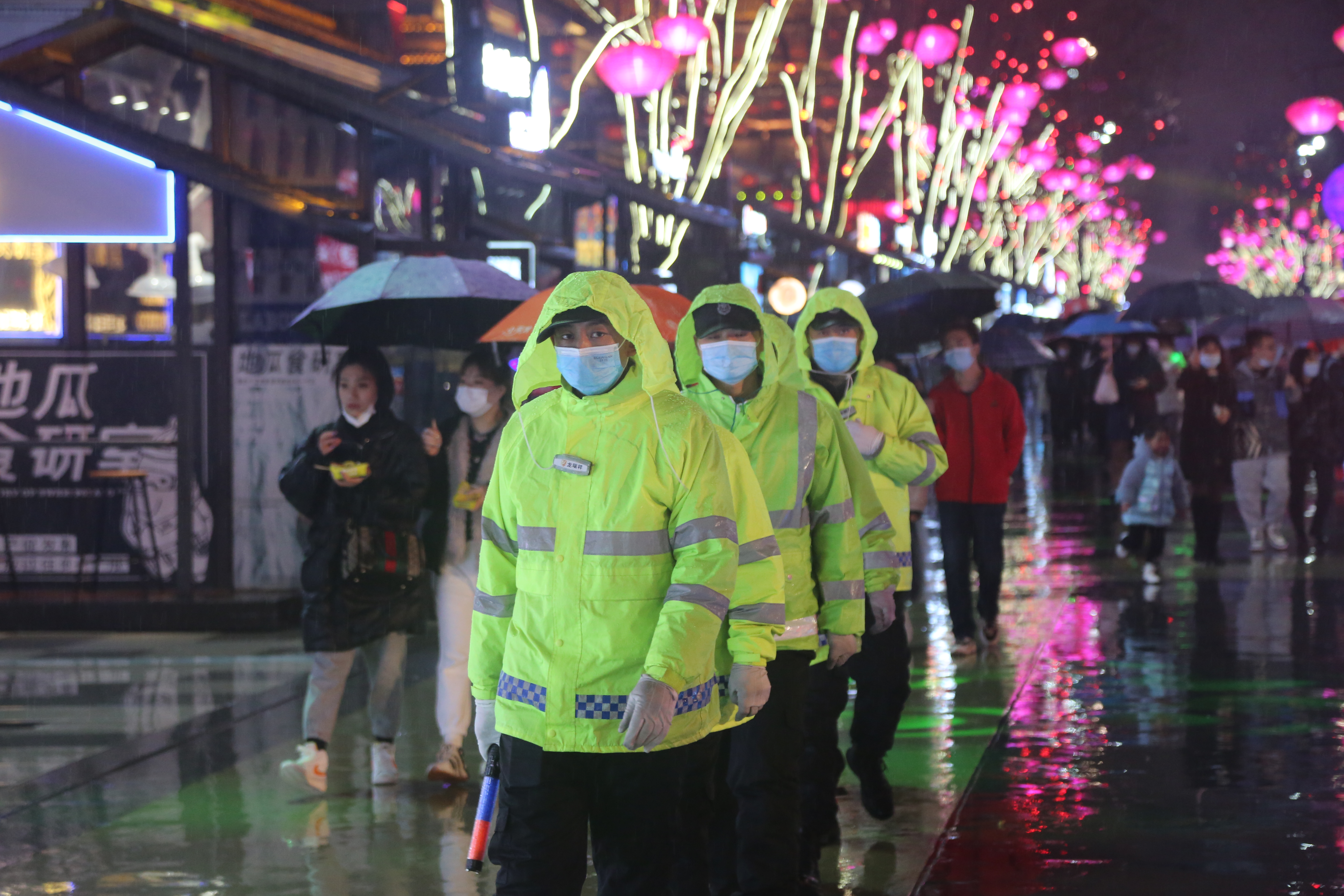2月25日,农历辛丑牛年正月十四日晚,华灯初上,大唐不夜城拉开了“花市灯如昼”的元宵序幕。安保人员坚守岗位,做好疫情防控与人流疏导。来自天南地北的游客,穿梭于流光溢彩的花灯间,拍照留影,喜庆团圆。