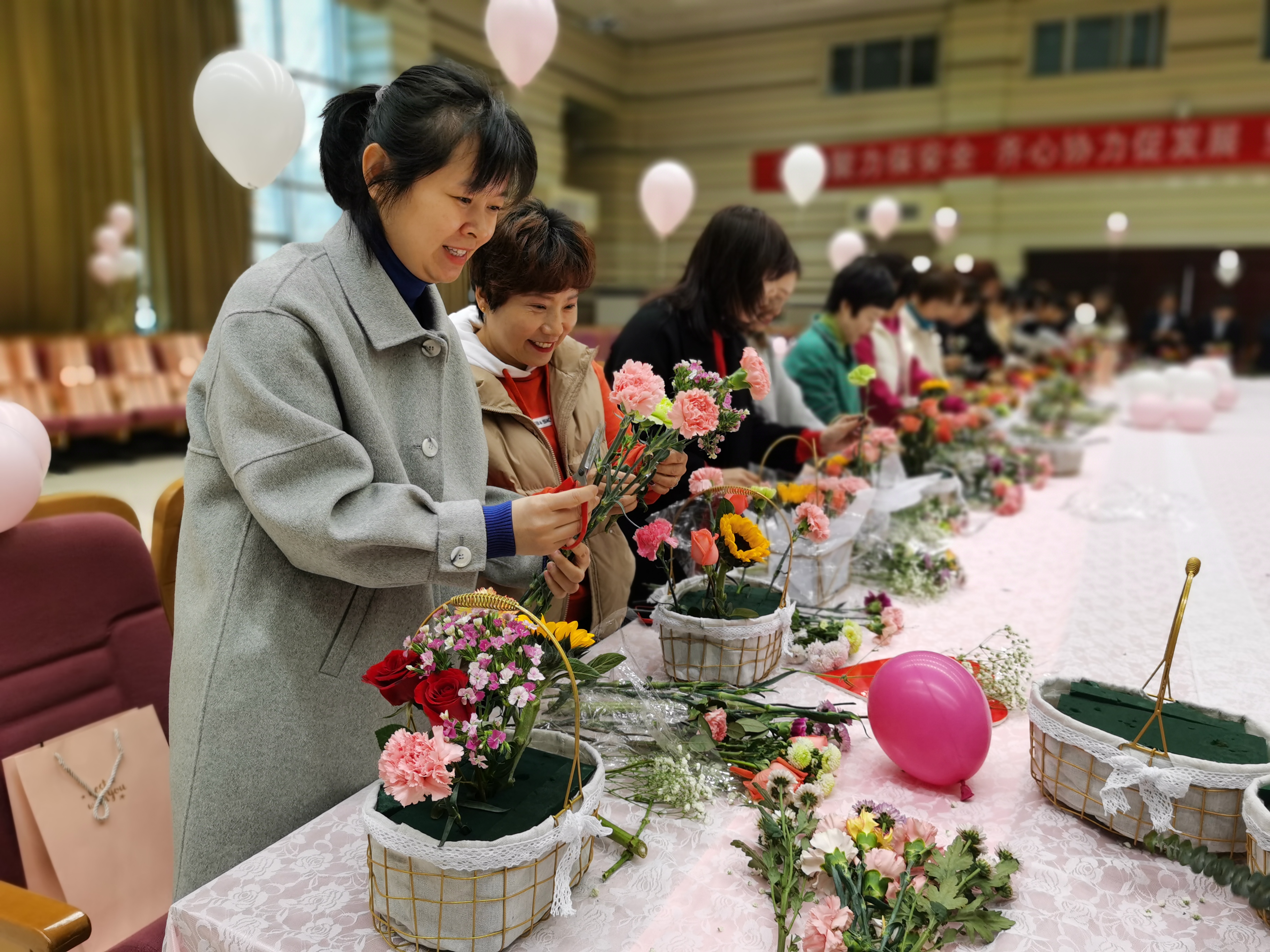 在老师的精心指点下,女职工们结合花材的特点从取材、剪叶、构图开始,不断尝试。有人手执长叶、鲜花进行修剪,有人从容不迫,拿着修剪好的花朵开始往花篮上装饰……玫瑰、百合、康乃馨,一朵朵鲜花在不同的组合下呈现出不同的风格,明艳动人,鲜艳好看。