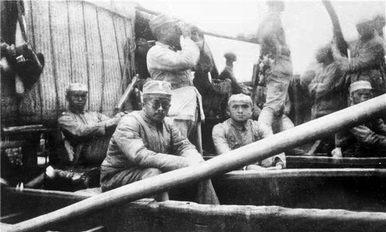 朱德(左三)、任弼时(左二)和邓小平(左四)在韩城芝川坐船进入山西。 资料照片