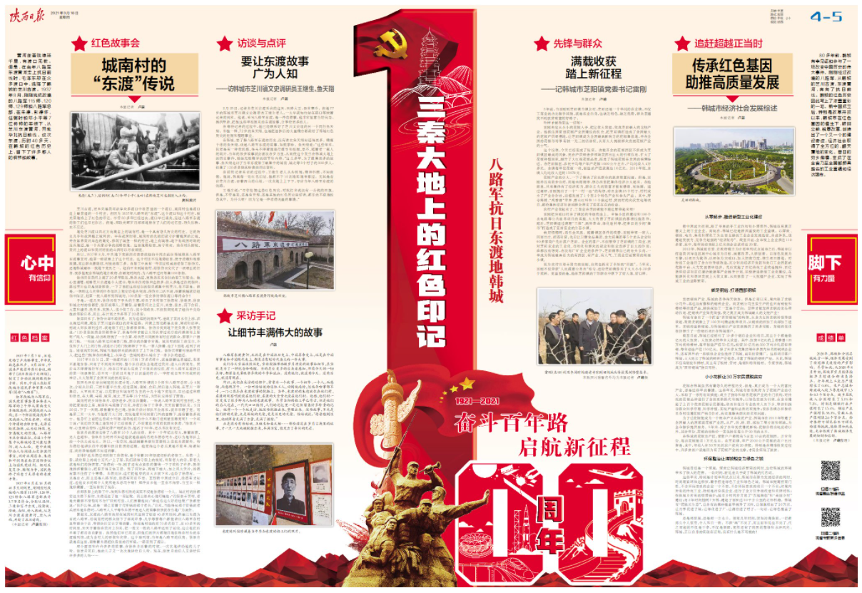 80多年前,韩城有幸见证和参与了一场改变中国历史的伟大事件。刚刚经过改编的八路军,从韩城的芝川古渡,东渡黄河,奔向了抗日前线。韩城的红色历史因此写上了浓墨重彩的一笔。新中国成立后,特别是改革开放以来,韩城市在红色基因的催生下,破旧立新,锐意改革,创造出了一个又一个的建设奇迹,经济社会取得了全方位的、翻天覆地的变化。昔日的穷乡僻壤,变成了在全省乃至全国都颇具盛名的工业重镇和经济强市。