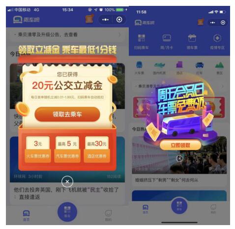 其中,“20元公交立减金”可于同程乘车呗小程序首页弹窗处领取,每位用户可一次性领取20元立减金,每日首次使用同程乘车呗小程序扫码出行可随机抵扣车费0.01-1.99元,最低可1分钱乘车,立减金不设期限,用完即止。
