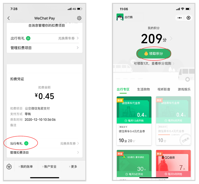 此外,为鼓励绿色出行,用户乘车扣款成功后可从微信支付消息进入“出行有礼”小程序领取积分,兑换腾讯专享好礼。