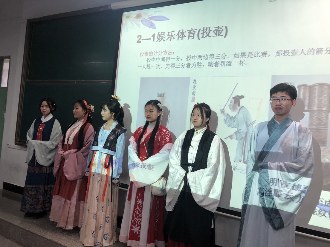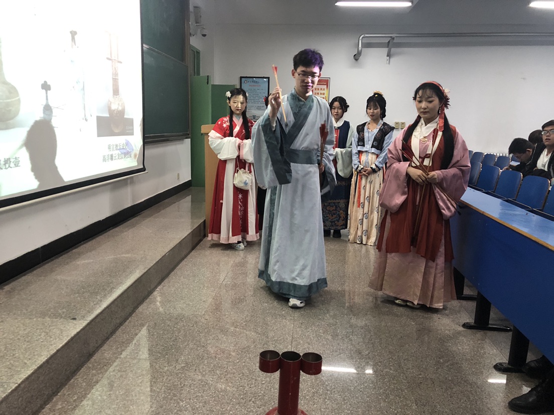 知晓了比赛规则后,咸阳师范学院汉服社的成员为同学们展示了分组PK赛。通过场景还原式的全套规则展示,加深了同学们对投壶游戏规则和相关礼仪文化的认知。
