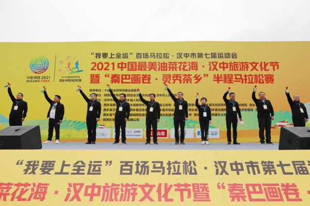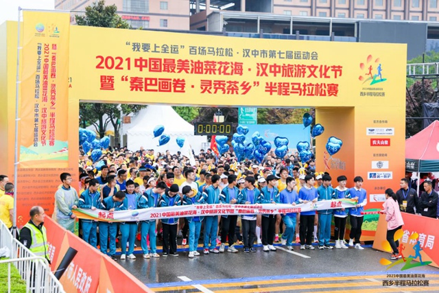 4月11日,“我要上全运”百场马拉松·汉中市第七届运动会2021中国最美油菜花海·汉中旅游文化节暨“秦巴画卷·灵秀茶乡”半程马拉松赛在汉中市西乡县鸣笛开赛。来自全国的3000余名跑友以奔跑的形式,拥抱中国最美油菜花海,感受山明水秀、宜居宜业的西乡魅力。