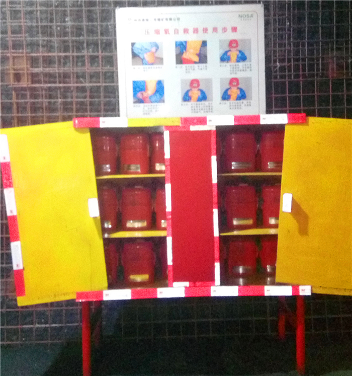 据了解,该矿设计的自救补给站长1.3m,高1.5m、宽0.55m,由直径48mm镀锌钢管及2mm钢板焊接而成,安设简单,移动方便,经久耐用,箱体部分分为三层,每层能存放ZYX-60自救器10台,每个自救器补给站共能存放自救器30台,采用推拉门设计,当发生灾害事故时可将两侧门推向中间位置,便于自救器的存取,正常生产期间关闭推拉门,防止自救器淋水损坏、丢失等。