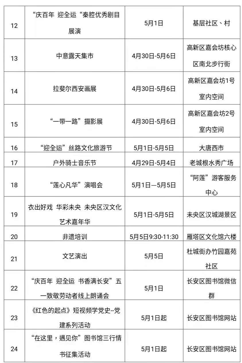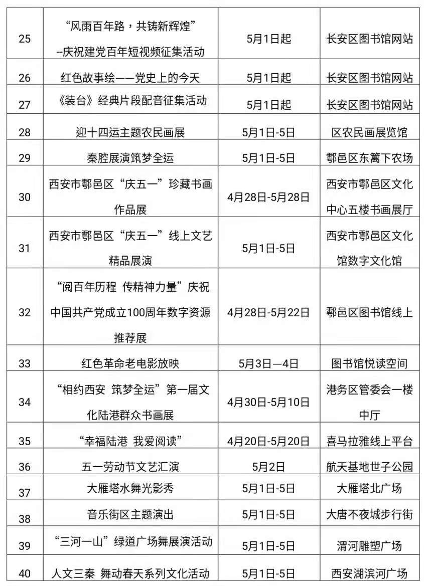 其中西安城墙景区推出了2021西安城墙五一主题系列活动;大唐不夜城举办以“筑梦全运 常来长安”为主题的系列活动,大唐芙蓉园景区开展首届华服大赏——2021大唐芙蓉园踏春季暨五一主题活动;陕西大剧院、西安音乐厅,西演live、青曲社将在五一长假推出话剧、音乐会、相声等精彩演出及剧目。全市还将举办“绿水青山幸福西安”摄影展、西安市非遗博物馆非遗展等活动。