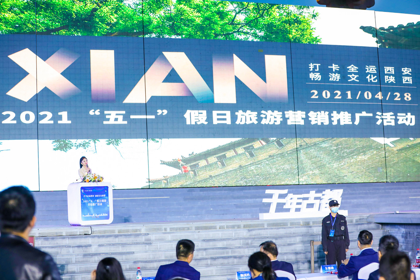 4月28日晚,由陕西省文化和旅游厅指导,西安市文化和旅游局、曲江新区管委会、宝鸡市、咸阳市、铜川市、渭南市、延安市、安康市、商洛市等地文旅部门共同主办的“打卡全运西安 畅游文化陕西”2021“五一”假日旅游营销推广活动在曲江大唐不夜城开元广场举行。省文旅厅省二级巡视员朱耀勋宣布活动启动,西安市政府副秘书长杨国胜出席活动,各地市文旅局负责人、西安市各区县(开发区)文旅部门负责人、文旅单位代表、新闻媒体和市民游客近300余人参加了本次活动。