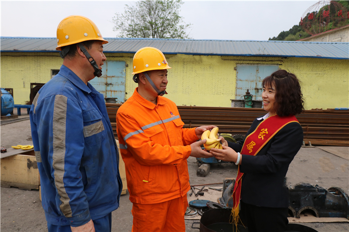 在该公司机电队院子,看到正在检修设备的职工,家属协管员将提前准备好的香蕉、葡萄、橘子、苹果等水果食品送到职工手里说到“师傅们,您们辛苦啦!吃点水果,休息一会儿吧!”在活动现场,家属协管员不仅送上香甜可口的水果,还为职工送上茶水。从家属协管员手中接过茶水,机电队职工史利宏高兴的说“今天的水果好吃,茶水也好喝!”