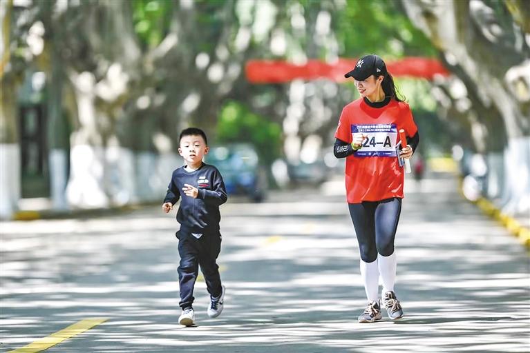 2021陕西省大学生马拉松联赛(教职工组)在西安交通大学站举行。图为职工和家属一起跑马拉松。 记者 李慧君摄