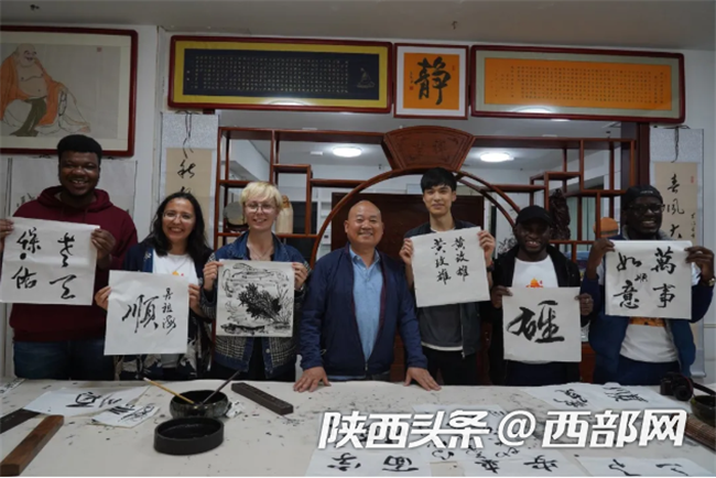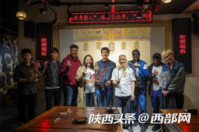 外国达人体验皮影、老腔和书法等中国特色文化。