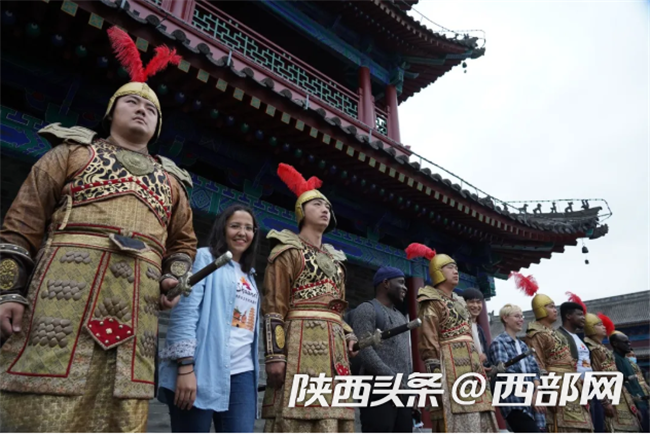 外国达人与最近爆红的西安城墙金甲武士合影。