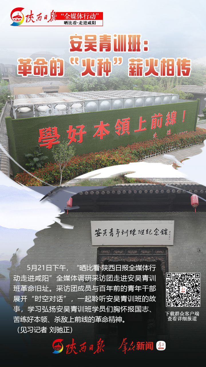 5月21日下午,“晒比看·陕西日报全媒体行动走进咸阳”全媒体调研采访团走进安吴青训班革命旧址。采访团成员与百年前的青年干部展开“时空对话”,一起聆听安吴青训班的故事,学习弘扬安吴青训班学员们胸怀报国志、苦练好本领、杀敌上前线的革命精神。