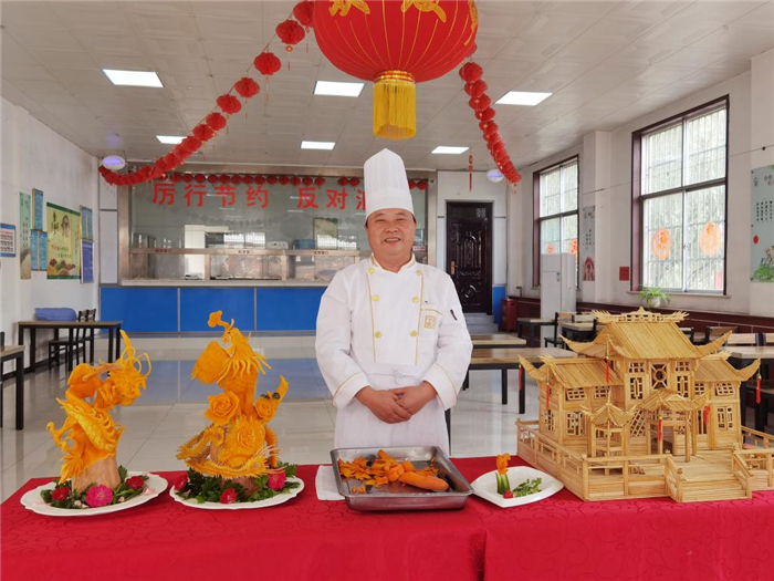当笔者问起行政部职工餐厅李小锋是哪个学校毕业的时候,他笑着说:“做饭做菜是以前打工的时候学的,绘画、雕刻、书法都是自学的。现在网络很方便,只要人勤快,想学什么都可以,再加上平常多看多练习就能做好。像我雕刻的南瓜造型,从买南瓜的时候,就要根据构思去选南瓜的形状,雕刻的时候再根据南瓜的形状雕刻,这样刻出来的造型才惟妙惟肖。”