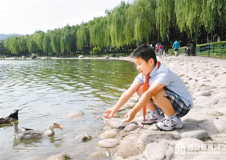在曲江池边给鸭子喂食的小学生杜昱龙说,欢迎小朋友们来美丽的山水之城西安游玩。 西安报业全媒体记者 李欣 摄