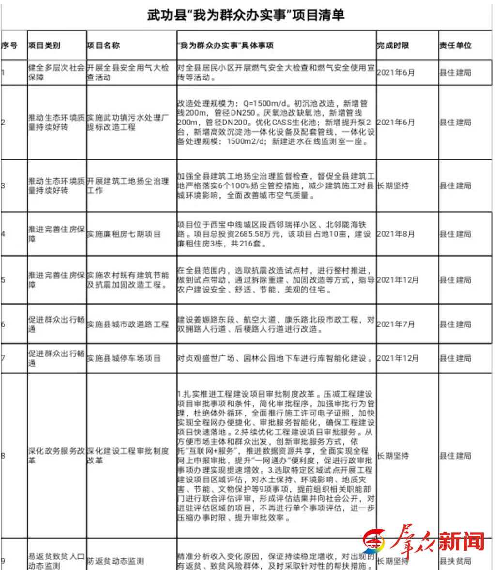 为检验党史学习教育成果,进一步切实解决关系群众的各种“急难愁盼”,在这份名为《全县“我为群众办实事”实践活动实施方案》的文件里,详尽罗列了武功全县各级各相关部门在党史学习教育中要办的205条“‘我为群众办实事’项目清单”。