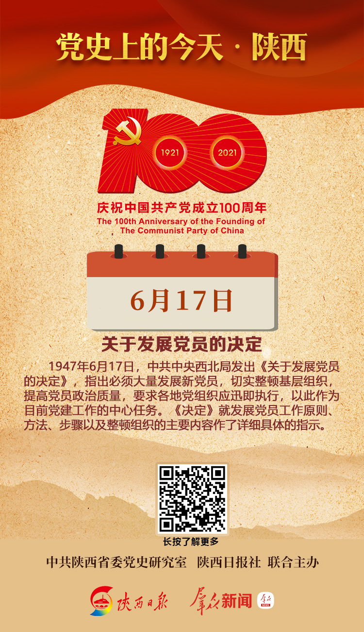 1947年6月17日,中共中央西北局发出《关于发展党员的决定》,指出必须大量发展新党员,切实整顿基层组织,提高党员政治质量,要求各地党组织应迅即执行,以此作为目前党建工作的中心任务。《决定》就发展党员工作原则、方法、步骤以及整顿组织的主要内容作了详细具体的指示。