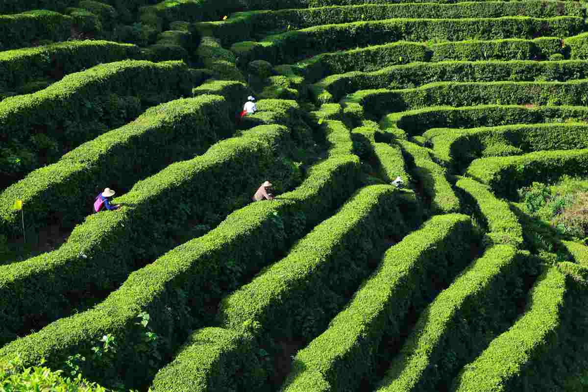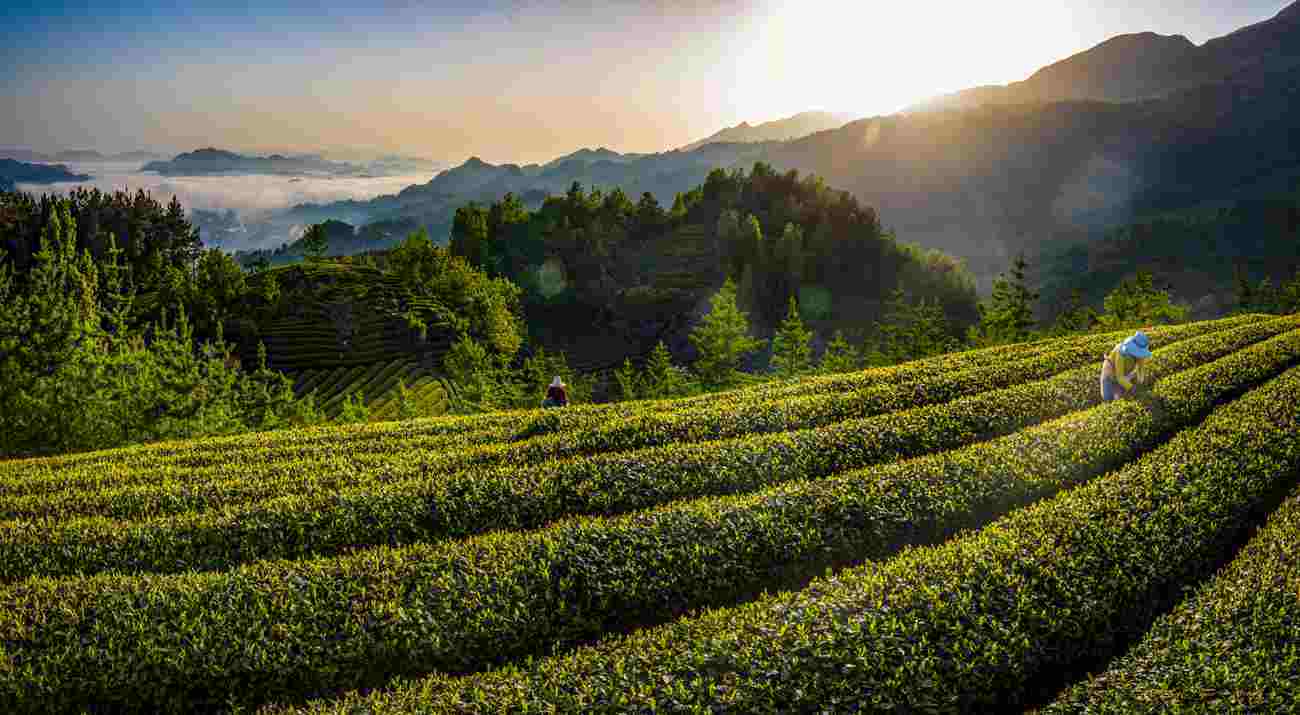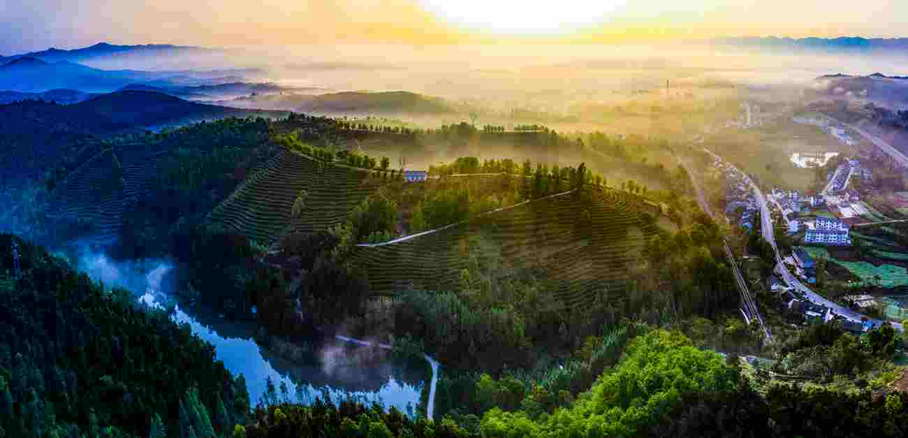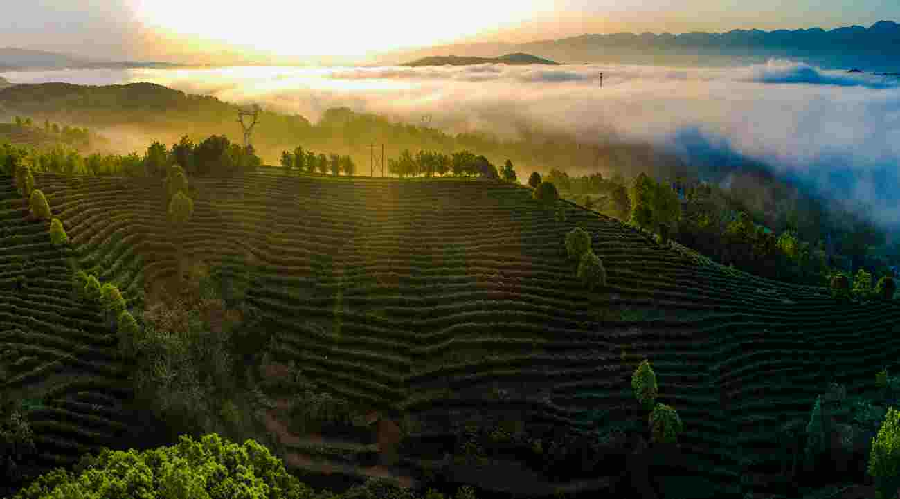 初阳升起,柔和的晨光透过树丛,飘洒到沉寂一晚的幽香茶园,如梦如幻……层层茶田绿意盎然,晨雾缭绕,云蒸霞蔚宛若仙境。