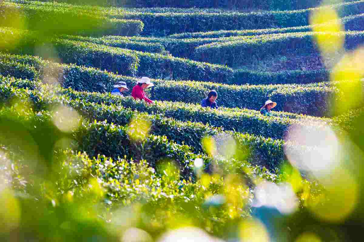 在如画的茶园中,茶农们头戴草帽、腰挎竹篓,娴熟地采摘着嫩芽,组成了茶山上一道亮丽的风景线。