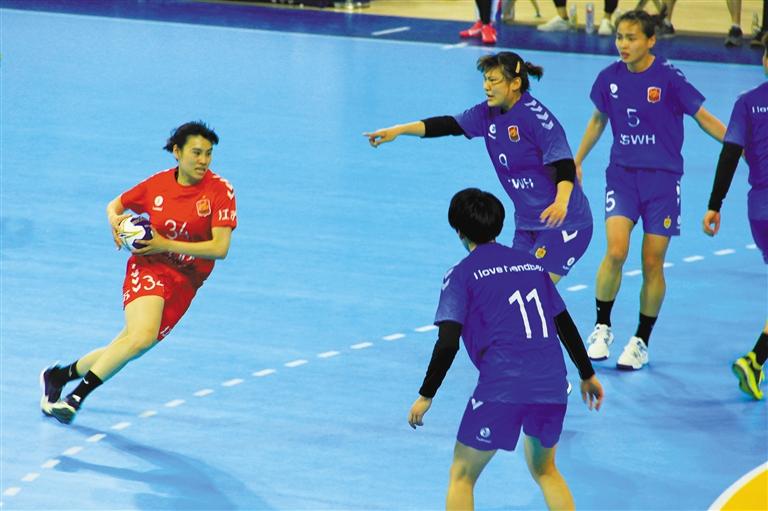 大“花生”有颜值更有实力,全新的球场让姑娘们尽情发挥。测试赛上,运动员们你攻我守、积极拼抢,传接球花样繁多,配合默契。参加这次比赛的部分运动员还是国家女子手球队运动员。江苏队的34号运动员金梦青是女子手球国家队的主攻手,在2018年亚洲女子手球锦标赛第三名和第四名争夺战上,她获得“最佳运动员”称号,在十四运会手球测试赛首场比赛中,她再次获得此项荣誉。下场后,她笑着说:“这片场地好,不是硬邦邦的木地板而是塑胶的,摔倒了也不疼,我能放开了打。”