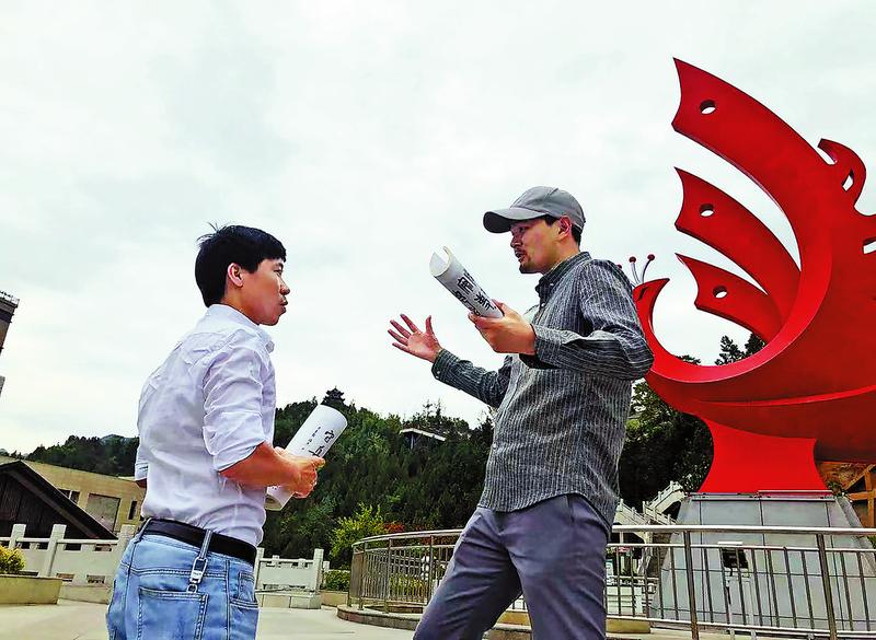 6月23日,殷书祥导演(右)在山阳翠屏公园勘景。