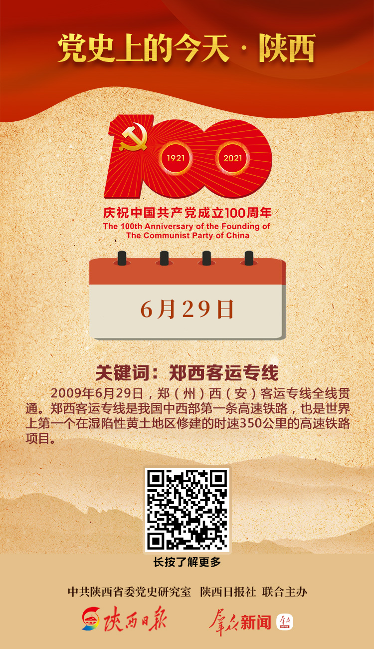 2009年6月29日,郑(州)西(安)客运专线陕西段和河南段最后两对500米龙口轨对接合龙,全长458.28公里的郑西客运专线全线贯通。2010年2月6日,郑西客运专线首列G2004次“和谐号”动车组列车从西安火车站驶出,标志着陕西省步入高速铁路的新时代。郑西客运专线是我国中西部第一条高速铁路,也是世界上第一个在湿陷性黄土地区修建的时速350公里的高速铁路项目。