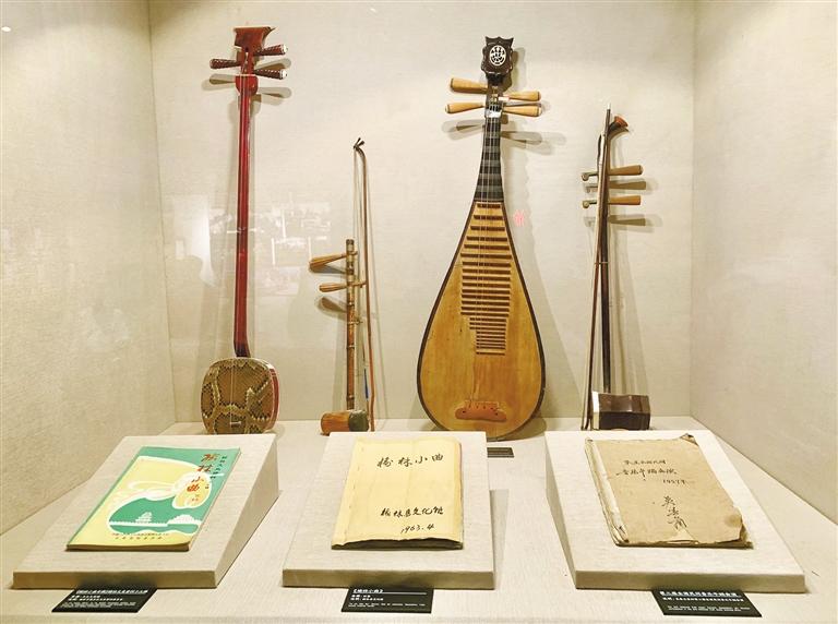 陈列于陕北民歌博物馆内的榆林小曲演奏乐器与书籍。记者 王梓萌摄