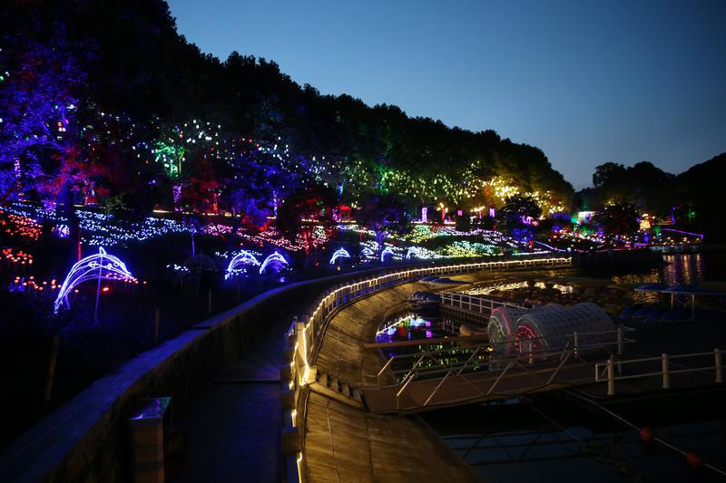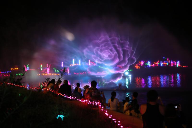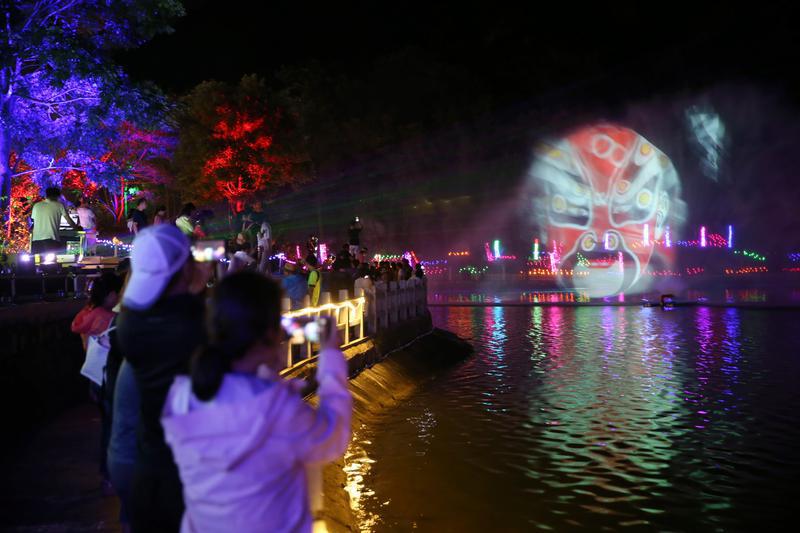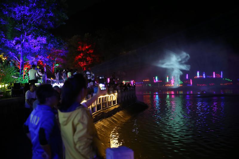 方圆两平方公里的光影秀游览区,以景观线勾连的迎宾松、天池、玉案峰、天池慢步道等核心景点,以山水为台,以光影为形,以文化点睛,“玉案光影”“梦幻彩蝶”“森林麋鹿”“风吹麦浪”“天池水幕”“超级月亮”“时光隧道”“海上钢琴师”“舞动青春”“蝴蝶泉边”等十大场景色彩绚丽,湖面与石山相映成趣,完美交融,营造多维度游园体验空间和全新超级网红打卡地,可满足不同年龄段的观赏需求,使翠华之夜又多了一份浪漫情愫。《天池夜宴》水幕电影以独特的表现方式,演绎着翠华姑娘与潘郎对爱情忠贞不渝、敢于反抗封建礼教的故事,折射了民间对真善美的追求。