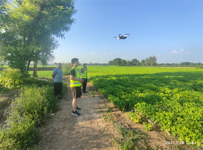 (中国太保的农险查勘员在鹤壁使用无人机对受灾花生进行查勘)