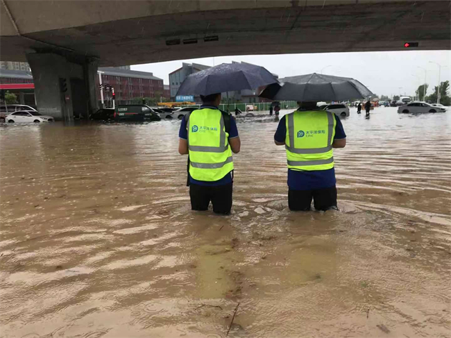 (客户车辆抛锚,中国太保查勘员翟昆仑和刘凯冒雨前往救援)