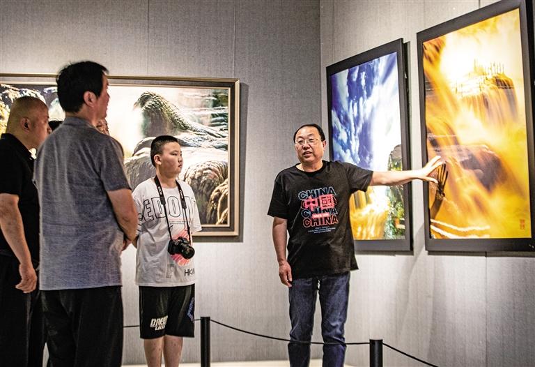 7月29日,李静(右一)向观众介绍他的黄河摄影作品。记者 赵晨摄