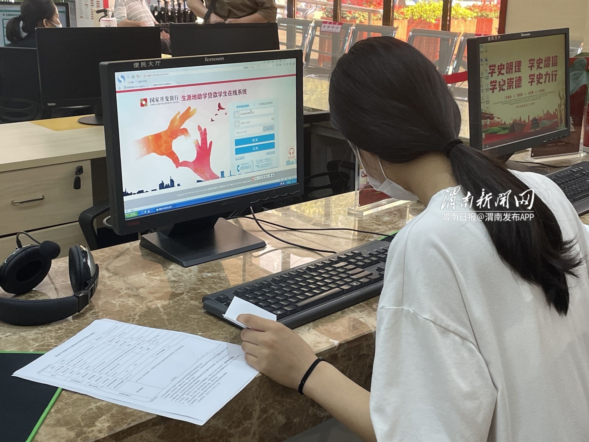 8月24日,在临渭区行政中心教育局业务窗口前,闫村镇史家村的史自强正在办理大学生生源地助学贷款,因为申请资料中的家庭地址填写有误,让他不知所措。办理引导人员了解情况后,立即带他到窗口电脑上进行了更改,随后史自强顺利地办理了助学贷款。截止目前,临渭区为1506名大学生办理了信用助学贷款。
