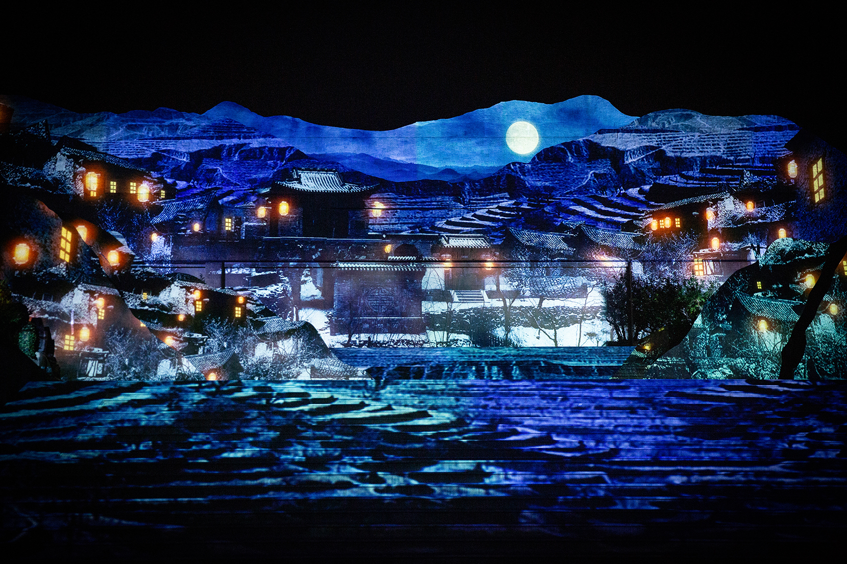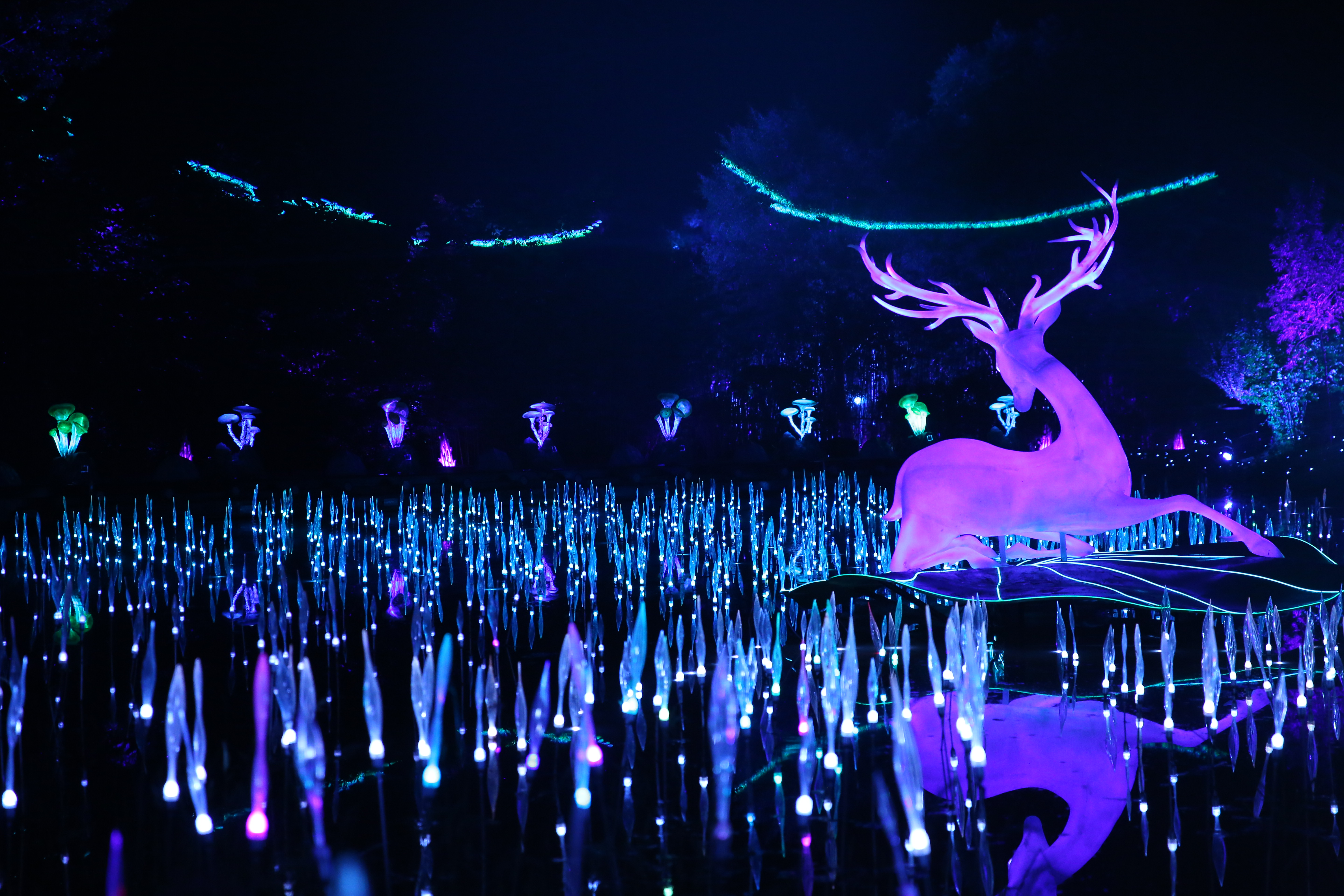 每晚,绚灿的灯光点燃了白鹿原的夜。从景区电梯下站平台开始,一场无与伦比的演出启幕了。《夜谭·白鹿原》将光影艺术与自然景观融为一体,由入境寻光、鹿林仙境、月下鹿影、仙草丛林、神鹿降世、月下斑斓、白鹿生灵、云端梦境、蝶恋纷飞、丛荫寻影、星途唤月、家国大爱、白鹿化仙十三个分区场景贯穿而成,全方位多角度还原了事件过程。