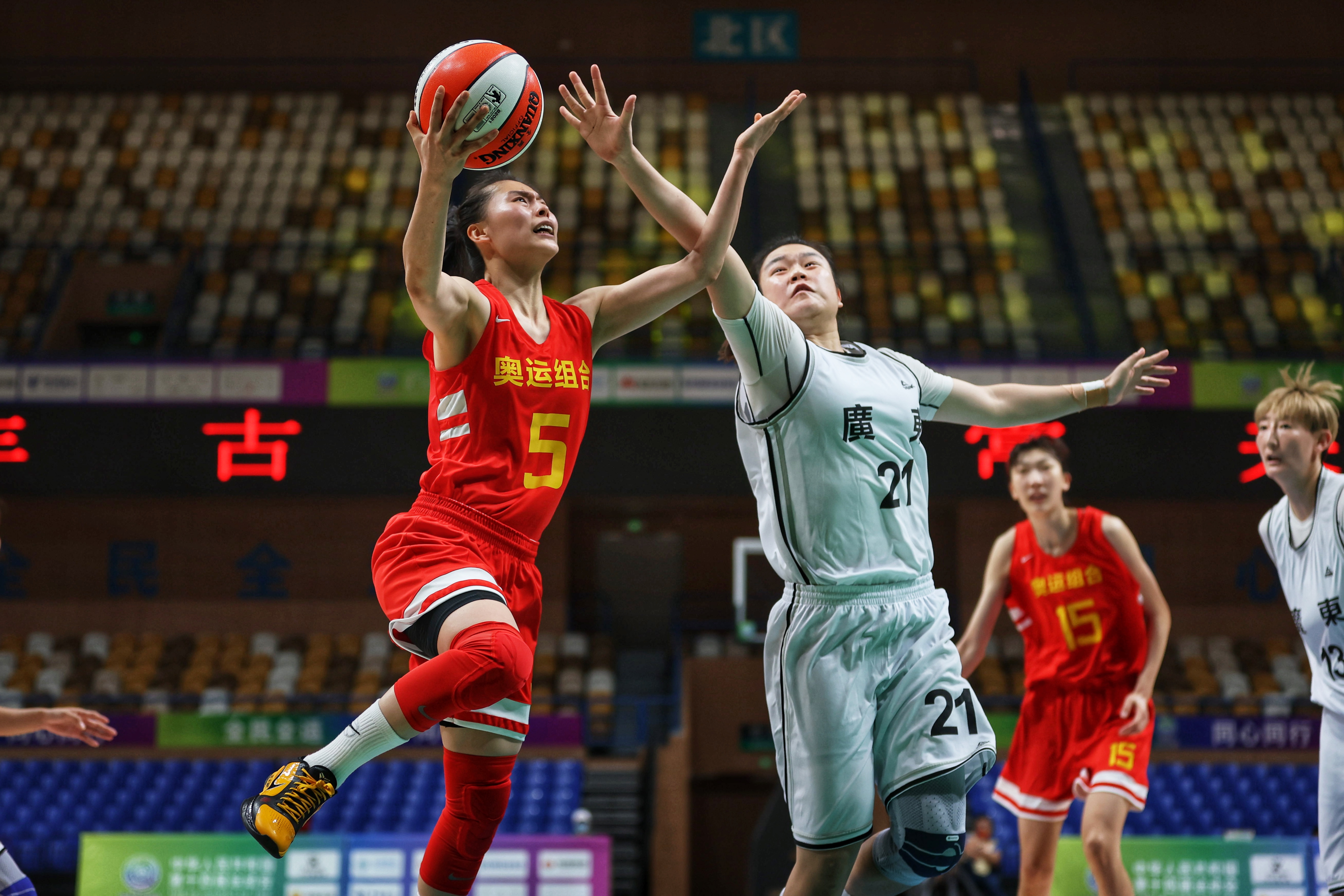 刚刚参加完东京奥运会的国家女篮队回国后迅速调整状态,由她们组成的奥运组合队首次在全运会赛场上登场亮相。当日进行的第二场比赛,奥运组合队迎来了本次全运会之旅的第一个对手广东队。比赛一开始,奥运组合队便以10比0的开局建立优势,而广东队面对实力强劲的奥运组合队频频出现失误。整场比赛,奥运组合队展现出强大的统治力,最终以110比51的比分大胜广东队。