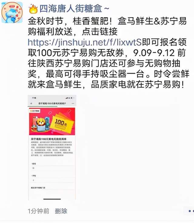 昨天,王涛发现自己所在的盒马社群,也推送了苏宁易购的领券链接。来自盒马鲜生的工作人员告诉他:“只要出示X会员在苏宁易购门店购物就可以减100元……”