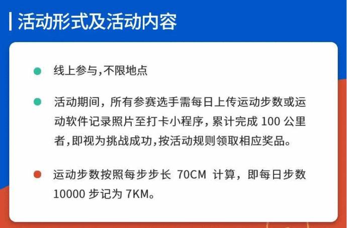本次挑战赛选择的减肥方式是“健步走”,相比于其他运动,走路的优点十分突出:非常简单、容易坚持、对膝盖友好,并且适合大多数人。活动期间,所有参赛选手需每日上传运动步数或运动软件记录照片至打卡小程序,累计完成100公里者,即视为挑战成功,按活动规则领取相应奖品。