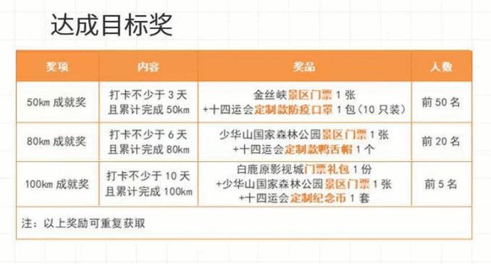 本次挑战赛设置50KM、80KM、100KM成就奖,走路或者跑步均可,每天6000-11000步,即有机会获得十四运会热门赛事门票、特许商品纪念品、白鹿原影视城门票礼包、少华山国家森林公园景区门票、金丝峡景区门票、精品酒店免费体验房及健身工作室自主训练卡。