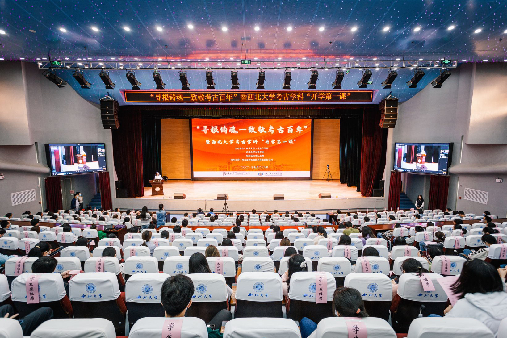 西北大学主会场的同学带来自主创作的“致敬考古百年”朗诵节目后,全体师生共同观看西北大学教授王建新为新生送上的“开学第一课”视频寄语,王建新在视频中希望大家继承开拓进取、坚韧不拔的张骞精神,有更多更年轻的一代坚持不懈,成为未来新一代考古学家,争取在学术上获得丝绸之路考古话语权。全体师生在文化遗产学院院长马健带领下诵读祭文章节,领悟82年前西大人的学术精神,大家在活动结束后参加“考古百年 未来有我”签名活动。