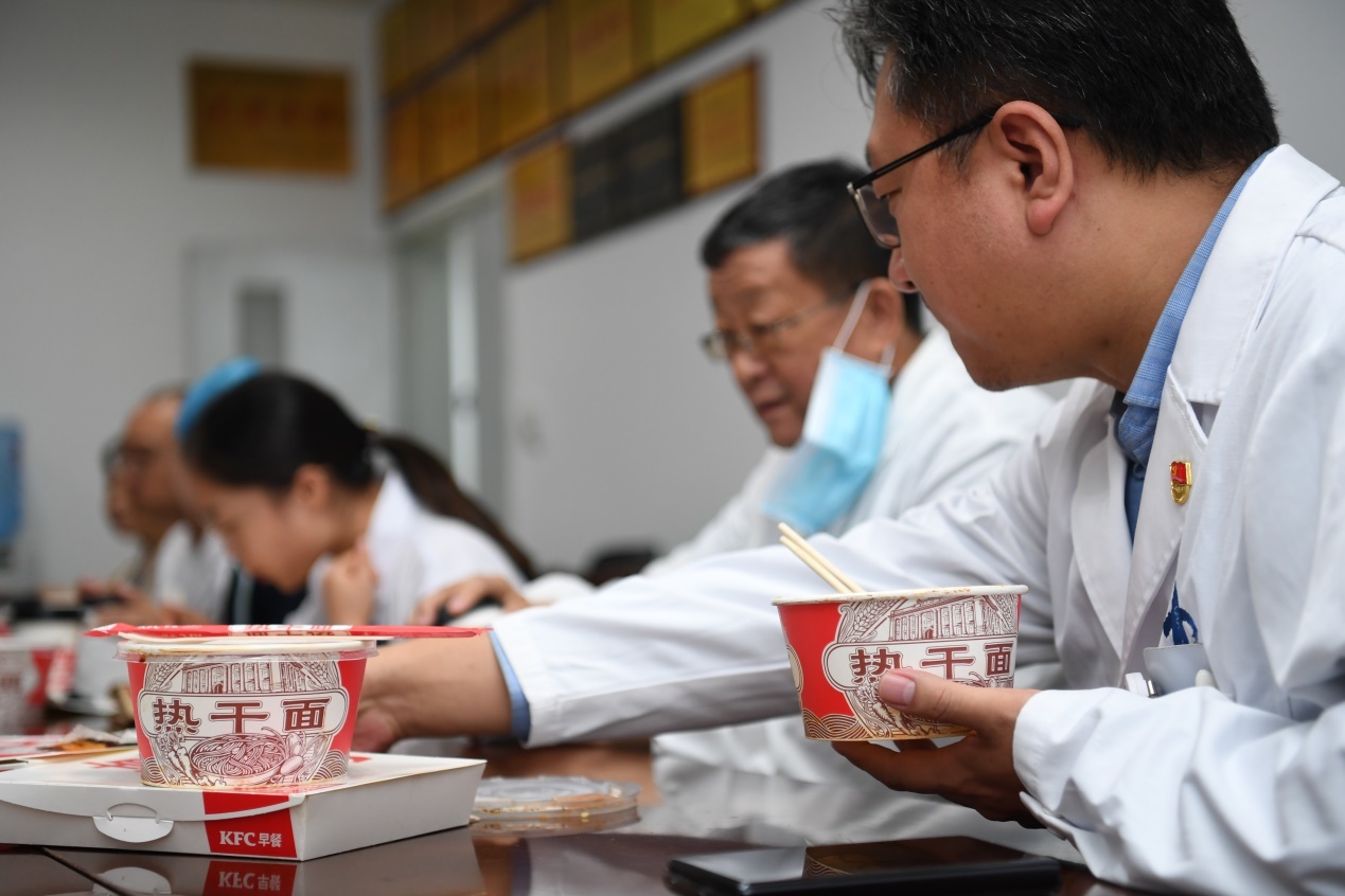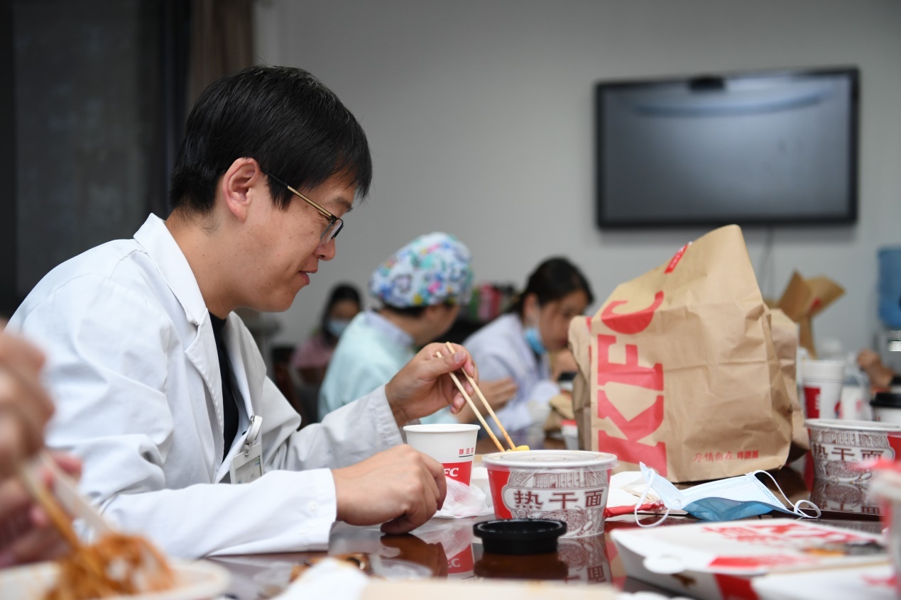 急诊科医生们此时正匆忙地走进休息室,准备吃过早餐后继续手头上的工作。而他们发现,这一天的早餐却与往常不太一样——一份热腾腾的肯德基热干面。绵密的酱汁、弹牙的口感,一下子让刚刚下夜班的郝琳护师想到了那座自己曾拼命守护过的城市。