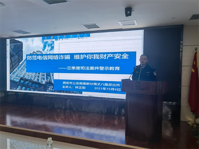 党史学习教育开展以来,新华保险陕西分公司积极开展“我为群众办实事”实践活动,为防范电信诈骗,提升员工防范能力,守住员工的“钱袋子”,10月9日,新华保险陕西分公司特邀西安市公安局高新分局丈八路派出所民警走进职场,开展主题为“防范电信诈骗 维护你我财产安全”现场宣导,10名警官、分公司全体内勤现场参会,各中心支公司视频参会。