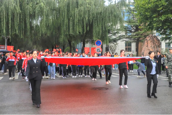 百名师生代表、民主党派代表、校友代表组成的12个方阵以饱满的热情传递红旗