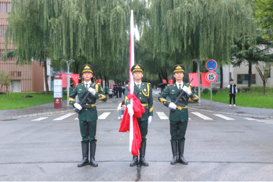 吹响升旗号角,升旗仪式正式开始,国旗护卫队护旗而出铿锵有力的正步步伐,铿锵响亮的脚步声响彻东门爱国主义教育广场。