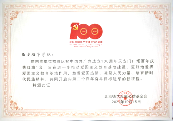 金秋十月,丹桂飘香,在中国共产党成立100周年的伟大时刻,在西安培华学院建校93周年的时间节点,西安培华学院获赠天安门广场建党百年红旗,学校隆重举行捐赠仪式、升旗仪式。