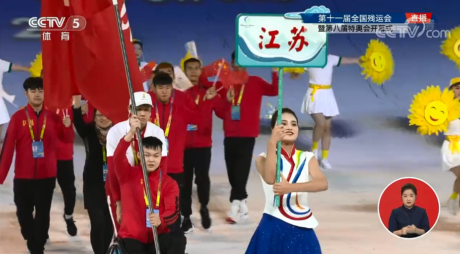10月22日晚,全国第十一届残运会暨第八届特奥会开幕式在西安奥体中心体育馆隆重举行。江苏省代表团入场。
