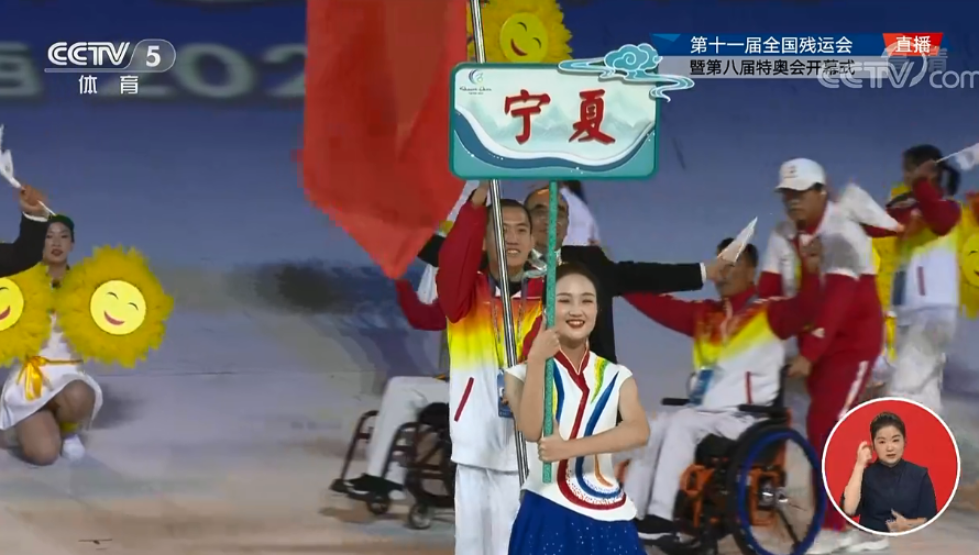 10月22日晚,全国第十一届残运会暨第八届特奥会开幕式在西安奥体中心体育馆举行。宁夏回族自治区代表团入场。