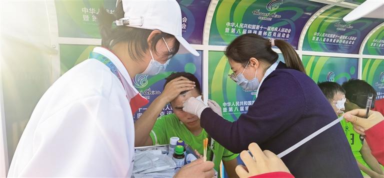 10月22日,残特奥会盲人足球项目开赛首日,场上的6名医疗保障人员就接诊了近10名需要现场治疗的残疾人运动员,到24日晚第3个比赛日结束,他们已经为20多名运动员处理过突发状况。从紧急医疗点到场内虽只有短短不到5米的距离,但每一名医疗保障人员都数不清自己来来回回跑了多少趟,每天走2万步是他们的常态。