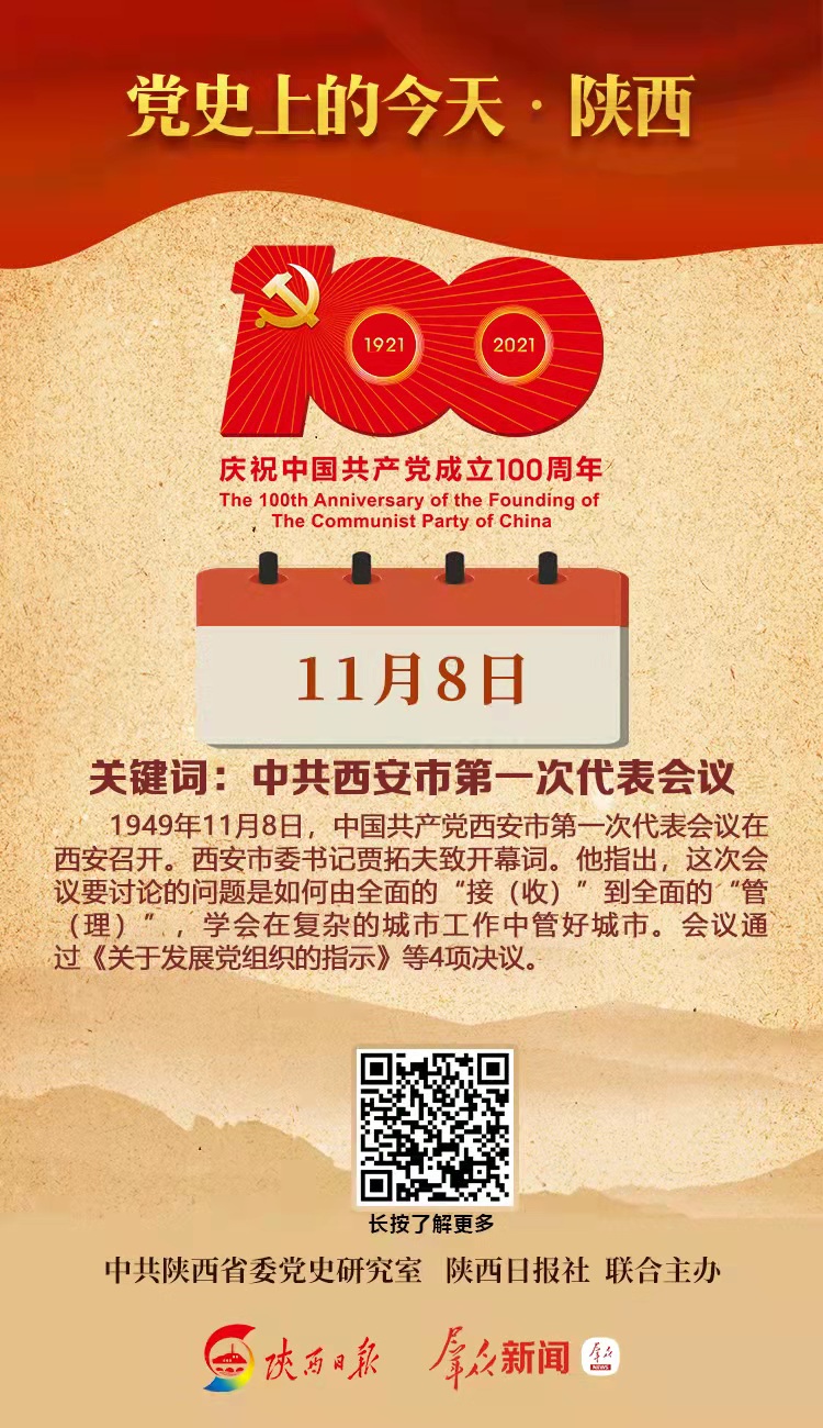 1949年11月8日,中国共产党西安市第一次代表会议在西安召开。西安市委书记贾拓夫致开幕词。他指出,这次会议要讨论的问题是如何由全面的“接(收)”到全面的“管(理)”,学会在复杂的城市工作中管好城市。会议通过《关于发展党组织的指示》等4项决议。