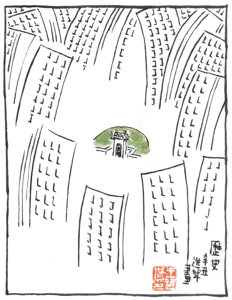 这里已经辟为秦二世皇帝陵遗址公园了,且占地面积近乎七十亩,环绕其冢,有青砖铺路,径或曲或直,无不通幽,大显了规划之匠心。紫叶李很多,遂能翘楚;竹子集合成丛,更是峻茂;柏树从封土上延出,择道边发展;松树也在道边发展,便产生了某种肃穆感和庄严感。鸟鸣清脆。而各种各样的住宅就在这里崛起了。秦二世皇帝能遇到一个地产时代,是他想不到的。